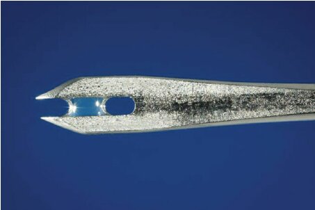 Aiguille bifide pour vaccination intradermique. L’image ne rend pas compte de la souplesse de l’aiguille et de l’écartement des deux dards lors de la pénétration dermique
