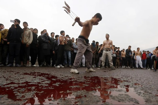 Et c’est une tradition Chiite qui s’appelle l’Achoura et dont on a d’ailleurs à Reims des images, puisque nous sommes quand même à Reims, sur une radio rémoise, nous avons une collection de photos de cette cérémonie, si je puis dire, prise par Hugues Krafft dans le Caucase à la fin du XIXème quand il a fait son voyage là-bas. On voit très bien sur ces photos que les policiers russes du Tsar se contentent avec des cannes d’empêcher les types, couverts de sang, de se taper trop fort sur le crâne. vous voyez un peu l’ambiance. Je sais bien que le clergé chiite a interdit cette cérémonie barbare en Iran mais elle persiste à Kerbala en Irak et tout simplement à Kaboul en Afghanistan.